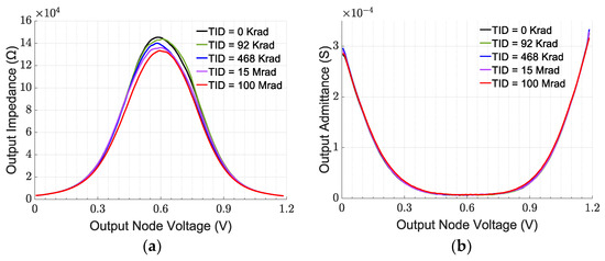 CP TID characterization: output impedance (a) and output admittance (b) for different TID levels.