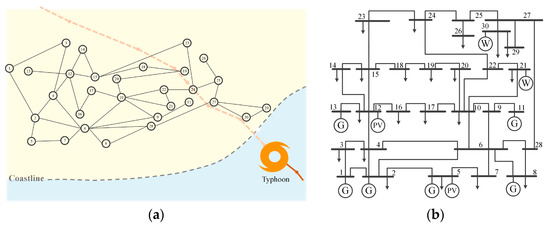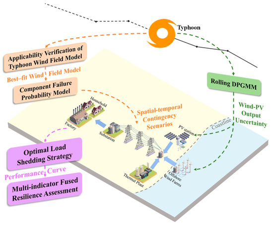 In recent years, the frequent occurrence of extreme natural disasters has posed serious challenges to the power grid. Although the power grid has taken a series of security and stability measures to ensure its safe and stable operation, in some extreme events (such as extreme weather), the last line of defense of the power grid is likely to be breached, resulting in large-scale blackouts. In 2012, Hurricane Sandy hit the East Coast of the United States, causing power outages for over 7.5 million users in 15 states and Washington, D.C. [1]. In 2018, Typhoon Mangkhut caused a power outage on 416 10 kV transmission lines of the Shenzhen power grid and a momentary loss of voltage in 6 110 kV substations, affecting 182,400 users. Super Typhoon Lekima, which landed on the southeast coast of China in August 2019, caused more than 4000 line faults and a power outage of 6,769,500 users. To a certain extent, this shows that the power grid is insufficient to cope with such high-impact low-probability (HILP) events [2]. Owing to the characteristics of HILP, once the extreme event occurs, it will cause huge losses, and proactive measures must be taken to cope with the high impact of the extreme events. In this context, the concept of power grid resilience has been put forward by the academic community, industry, and government departments to describe the ability of the power grid to prevent, resist, respond, and quickly restore power supply in the face of extreme events [3], among which extreme natural disasters (such as typhoons, rainstorms, and ice hazards) are a typical representative of such extreme events. With the increasing proportion of renewable energy generation in the power grid, photovoltaic (PV) power output is closely related to incident irradiance and temperature, while wind power output is closely related to wind speed and air density [4]. It is noteworthy that the risks posed by climate change and the integration of renewable energy are not independent but interrelated [5]. Obviously, renewable-energy-based power grids will be more susceptible to extreme weather conditions, thus posing a serious threat to the safety and stability of the power grid [6]. Therefore, it is of great practical significance to explore the resilience of power grids against extreme natural disasters such as typhoons.
