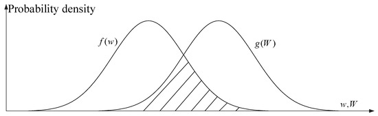 where is the mean value of the component design load; the line variation factor is taken as 0.03; the tower variation factor is taken as 0.10. When the component design wind load exceeds the actual wind load, the component can be operated reliably; conversely, when the component design wind load is less than the actual wind load, the component may fail. It is assumed that the component design wind loads and actual wind loads follow probability distributions and , respectively, and the failure probability of the lines and the towers in this period can be obtained by the stress–strength interference method [58], as shown in Equation (20) and Figure 2.
