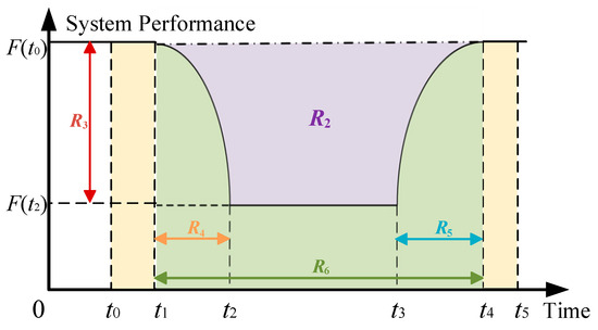As mentioned above, many current studies define the resilience indicator as the integral of the difference between the pre-defined system performance indicators at time t and the performance indicator before or after recovery. However, it should be noted that using only the amount of load shedding as an indicator cannot reflect the important characteristics that can also reflect system resilience, such as duration of load shedding, maximum amount of load shedding, and other existing performance indicators. In this paper, some crucial indicators such as critical load shedding ratio, load shedding area, maximum amount of load shedding, load loss time, load recovery time, and duration of load shedding, established from the perspectives of priority, robustness, rapidity, and sustainability, as shown in Table 1 and Figure 3, will be fused to conduct the comprehensive resilience assessment for the power grid to be studied. In Table 1, R1 is the critical load shedding ratio in the range of , and the smaller the value, the better the system resilience; R2 is the load shedding area in the range of [0, Pd·T], and the smaller the value, the better the system resilience; R3 is the maximum amount of load shedding in the range of [0, Pd], and the smaller the value, the better the system resilience; R4, R5, and R6 are the load loss time, the load recovery time, and the duration of load shedding, respectively, and the larger the value of R4 as well as the smaller the values of R5 and R6, the better the system resilience. Here, the EWM [60] combined with the TOPSIS [61] is employed to implement a comprehensive and objective system resilience assessment.
