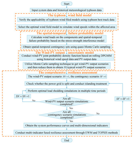 Regarding the comprehensive resilience assessment framework proposed in this paper, involving a typhoon wind field model, a spatial–temporal failure probability model, a wind-PV output uncertainty model, and a comprehensive resilience assessment method based on the optimal load shedding strategy, the corresponding solution flow chart is shown in Figure 4, and the specific steps are outlined as follows: