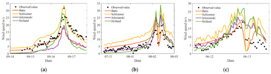In the typhoon wind field model, most of the initially proposed wind field models are characterized by circular symmetric wind fields [42] (such as the Rankine and Batts wind field models). To reflect the asymmetry of the wind field, the wind speed at a certain location is often regarded as the vector sum of the circulation wind speed and the moving wind speed, as shown in Equation (2). The circulation wind speed is obtained by a circular symmetric wind field model by assuming that the pressure gradient, Coriolis force, and centrifugal force are balanced, while the moving wind speed is obtained by a moving wind field model [43]. Commonly used wind field models mainly include the Rankine and Batts circular symmetric models based on Rankine vortices, the Schloemer model based on e-exponential wind fields, the Jelenianski-II model based on exponential wind fields, and the Holland [44] model proposed by using gradient wind relationships. This paper mainly focuses on the four aforementioned wind field models and conducts applicability verification using the measured typhoon data to identify and select the optimal wind field models among them.