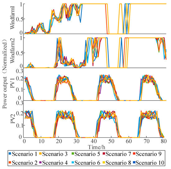 As is widely recognized, the power output of renewable energy sources such as wind farms and PV power stations is characterized by a high degree of uncertainty. The conventional modeling of renewable energy output uncertainty is usually based on long-term renewable energy output levels or probability density fitted from long-term wind speed and solar irradiance. Given that the movement of the typhoon center and the increase or decrease in typhoon intensity will have both temporal and spatial impacts on renewable energy output, it is crucial to consider the temporal and spatial correlations of renewable energy output when modeling during extreme typhoon events. This paper will leverage the rolling non-parametric DPGMM [54] method to model the uncertainties of wind farm output and PV station output, and employ the measured data to sequentially fit and sample the renewable energy output scenarios at the current calculated time. The wind speed and PV station output data within one hour before and after each time are used as input data for the rolling DPGMM [55] to model the probability density of wind-PV output uncertainty at the current time, as shown in Equation (15). When is a positive integer greater than one, Equation (15) is a generalized expression for a Gaussian mixture model (GMM), whereas in DPGMM, is an output parameter, which is the number of the mixtures of Gaussian distribution that the model automatically infers based on the input data.