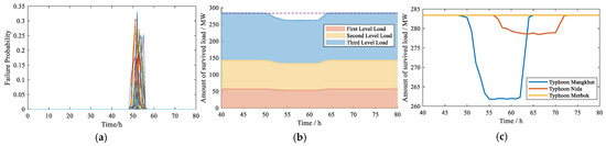 (a) Failure probability of all 41 lines during Typhoon Mangkhut; (b) the expected amount of survived load during Typhoon Mangkhut; (c) curves of the expected amount of survived load in the face of typhoons with different intensities.