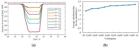 The occurrence of multiple lines in the same area being affected by extreme wind speeds readily leads to (N − 1)k contingencies. A total of 1000 contingency scenarios generated from (N − 1)1 to (N − 1)9 were selected to conduct simulations, and the curves of the amount of survived load for each (N − 1)k contingency are shown in Figure 9a. The load loss increases due to the increase in k. In the event of the (N − 1)9 faults, the system experiences a loss of nearly 10% of its load. We individually screened 1000 scenarios of each contingency level and calculated the time required to simulate each contingency 1000 times. Figure 9b indicates the average time required for one simulation. It can be noticed that as the number of disconnected lines k increases, the complexity of the faults increases, and the simulation time also increases. However, the calculation time does not significantly increase with the increase in k, and it only takes about 3 s to complete one simulation for the case of (N − 1)9. Therefore, the proposed method has a good trade-off between the calculation time and accuracy.