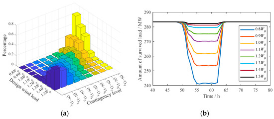 (a) Percentage of (N − 1)k contingency under different design wind loads; (b) curves of the amount of survived load.