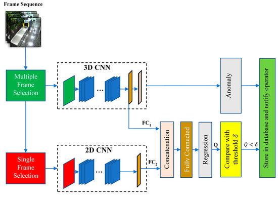 In proposed model, the features extracted through the Fully Connected (FC) layers of both CNNs are concatenated to form a more powerful feature extraction model. The features extracted through the 3D CNN (denoted as FC1 in Figure 1) can describe the relationship between anomalies and image quality in frame sequence, while the features of 2D CNN (denoted as FC2 in Figure 1) are specifically extracted based on the quality features of the image. As will be shown, both of these feature sets are effective in improving the accuracy of quality assessment. The concatenated features are reduced by the FC layer and finally, the quality of input is estimated through a regression layer. In the proposed model, the estimated quality (denoted as Q in Figure 1) is compared with an experimental threshold (). If Q is less than for an input video, a notification is sent to the operator reporting quality problem in the surveillance camera. In the following, both CNN models are described in detail.