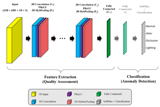 As mentioned, in the proposed model, a 3D CNN model is used to process a subset of the sequence of surveillance video frames. The proposed 3D CNN model is depicted in Figure 2. This CNN model was designed to fulfill two tasks: First, this model is used to detect the anomaly in the input frame sequences. This output is created through the classification layer in the illustrated structure, and based on it, normality or the presence of anomaly (jitter, occlusion, and light abnormality) can be determined. Second, this CNN model provides a part of the necessary features for video quality assessment through its fully connected layer. In this case, the activation values obtained from the FC1 layer are considered as extracted features in this CNN model. It should be noted that this 3D CNN is trained based on anomaly types of samples.