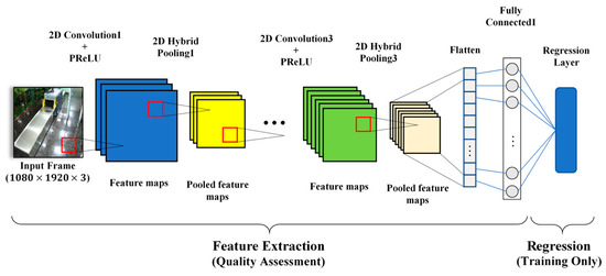 In this research, a 2D CNN is used to more accurately describe the quality-related features in surveillance videos. The model is fed through an RGB frame, with the lowest standard deviation in the input frame sequence. The structure of 2D CNN is depicted in Figure 3. The proposed 2D CNN for extracting quality-related features from the video has a similar structure of layer orders to the 3D CNN, with the difference that two-dimensional convolution and pooling layers are used in this model. On the other hand, every input frame is fed to this model without changing the dimensions so that the destructive effects of reducing the dimensions of the sample do not cause errors in the quality evaluation process. Also, the 2D CNN is finalized with a regression layer which is used for training CNN only. In this case, the 2D CNN model is trained by the quality target values of the samples.