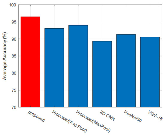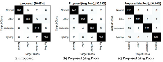 - Proposed (Avg. Pooling): In this configuration, all pooling layers in the 3D CNN model used in the proposed method were of the average pooling type.