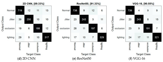In these confusion matrices, each column represents the actual labels of the test samples, and the rows represent the labels assigned by each classification method. For example, in Figure 5a, out of 806 samples belonging to the “normal” class (the sum of values in the first column of the matrix), the proposed method correctly classified 786 samples, and only 20 samples were misclassified into other categories. The interpretation of classification results for other existing categories is similarly possible. The proposed 3D CNN model could correctly classify 95.6% of jitter anomalies. On the other hand, the performance of this model in correctly classifying occlusion and lighting anomalies was 95.89% and 95.17%, respectively, which are significantly higher than the compared methods. Overall, the comparison of these confusion matrices shows that the proposed method has superiority over other methods in classifying samples of most categories and managed to increase the accuracy of anomaly detection by at least 3.39%.