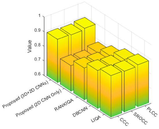 The results presented in Figure 9 show that the proposed method is superior to the compared methods in terms of the evaluated metrics. According to the obtained results, if only the 2D CNN model is used to assess the quality of samples, correlation-based criteria will be significantly reduced. This feature shows that the 3D CNN model can be effective in describing the temporal features of video frames for quality assessment purposes, so combining the features of these two CNN models can be effective in obtaining a more accurate model for quality assessment. According to these results, the LIQA [23] model has the closest performance to the proposed approach, but the simplicity of the proposed architecture compared to methods such as LIQA or DB-CNN makes our method suitable for real-world applications.