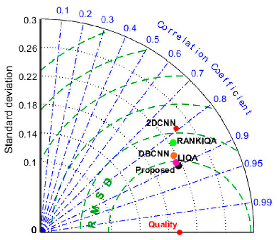 Figure 10 shows that the quality values assessed by the proposed method, in addition to being consistent with the subjective quality values, also have fewer differences. These results show that the scale of quality values produced by the proposed method is more consistent with the subjective quality values and this indicates the ability to understand and analyze the output of the proposed model better than other methods. Table 3 summarizes the performance of different methods in terms of quality assessment.