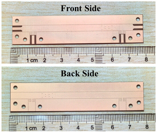 The proposed DI-BPF with transitions is designed by the PCB process. Rogers 5880,manufactured from Shenzhen Shangjihong Circuit Technology Company, is used as a dielectric material, which has a permittivity of 2.2 and a loss tangent of 0.0009. Copper is used as a metal material, which has a conductivity of 1.67 × 10−6 Ω·cm. To adhere the layers of the proposed DI-BPF with transitions, adhesive layers of 4450 PP are introduced between the dielectric 1 and the metal 2 and between the metal 3 and the dielectric 3, respectively. The 4450 PP has a thickness of 0.1 mm, a permittivity of 3.5, and a loss tangent of 0.002.