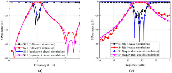 To verify the proposed equivalent circuit models, the S-parameters obtained from the equivalent circuit models are compared with those from the full-wave simulation software, as shown in Figure 6. The results demonstrate a basic agreement, indicating the accuracy of the equivalent circuit models. As for the results of the low-frequency bandpass filter illustrated in Figure 6a, the S-parameters acquired from the equivalent circuit model exhibit a commendable agreement with those obtained from the full-wave simulation software. As for the results of the high-frequency bandpass filter depicted in Figure 6b, both the S-parameters obtained from the equivalent circuit model and the full-wave simulation software demonstrate consistent trends, although there are slight deviations in values. The deviation primarily manifests in discrepancies in the insertion loss at the passband range. Notably, the insertion loss attained through the full-wave simulation software is inferior to that obtained via the equivalent circuit model. This discrepancy arises because the full-wave simulation closely resembles the actual situation with loss, whereas the equivalent circuit model represents an ideal scenario. Furthermore, this disparity becomes increasingly apparent at higher frequencies.