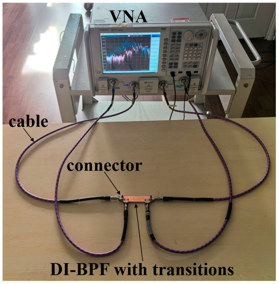 Four-port test system for measuring the fabricated DI-BPF with transitions.