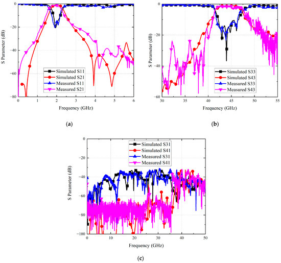 The simulated and measured S-parameters of the proposed DI-BPF with transitions are shown in Figure 8a–c. The measured results basically agree with those of the simulated ones. Figure 8a shows the simulated and measured S-parameters of the low-frequency bandpass filter. The simulated results of the low-frequency bandpass filter demonstrate a FBW of 15%, an insertion loss of 0.84 dB and a return loss of 19 dB at the center frequency of 1.9 GHz. The insertion loss remains below 2.0 dB and the return loss exceeding 10.5 dB in the low-frequency passband of 1.76–2.04 GHz. In contrast, the measured results of the low-frequency bandpass filter acquire the FBW of 15.7%, the insertion loss of 1.3 dB and the return loss of 16 dB at the center frequency of 1.9 GHz, and the insertion loss remains below 2.2 dB and the return loss exceeds 10.6 dB in the low-frequency passband of 1.75–2.05 GHz. Figure 8b shows the simulated and measured S-parameters of the high-frequency bandpass filter. The simulated results demonstrate the FBW of 11.1%, the insertion loss of 1.6 dB and the return loss of 27 dB at the center frequency of 44 GHz, and the insertion loss below 2.5 dB and the return loss exceeding 10 dB in the high-frequency passband of 41.6–46.5 GHz. In contrast, the measured results of the high-frequency bandpass filter acquire the FBW of 10.4%, the insertion loss of 1.9 dB and the return loss of 20 dB at the center frequency of 44 GHz, and the insertion loss below 2.7 dB and the return loss exceeding 10 dB in the high-frequency passband of 41.7–46.3 GHz. Figure 8c shows the simulated and measured isolation between the low-frequency bandpass filter and the high-frequency bandpass filter. The simulated |S31| and |S41| are lower than −33 dB, while the measured |S31| and |S41| are lower than −30 dB, which shows that the isolation between the two filters is high. Due to the calibration that has mitigated the impact of cables and connectors on measurement results, there exists only a slight discrepancy between the measured results and the simulated results. The slight discrepancy is mainly attributed to the manufacturing error.