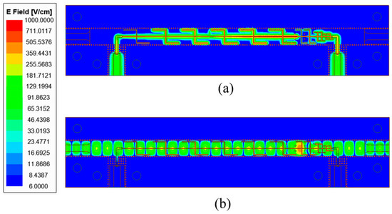 In addition, the Electric (E-) field distributions of the proposed DI-BPF with transitions at 1.9 GHz and 4.4 GHz are presented in Figure 9. The E-field distribution intuitively illustrates that the proposed DI-BPF with transitions can transmit in the low-frequency band with a center frequency of 1.9 GHz and in high-frequency band with a center frequency of 44 GHz.