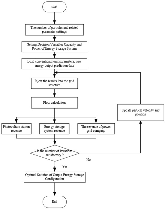 The solution process of storage system capacity optimization configuration based on modified PSO is depicted in Figure 2. It is important to note that the variable to be optimized in the multi-objective optimal configuration model is the installed capacity of ESS. The spatial positions of the particles are determined through the modified PSO.