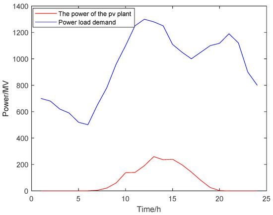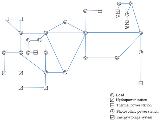 The adapted IEEE 14-bus network and the actual power grid in a certain area of Southern Xinjiang are taken as the case models for simulation verification. The load information and PV output curve in the case are shown in Figure 3. The improved network topologies are depicted in Figure 4 and Figure 5, respectively. The operating parameters of thermal units, ESS and hydropower units, the electricity price information, and equipment cost information are shown in Table 1, Table 2, Table 3 and Table 4, respectively.