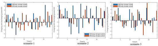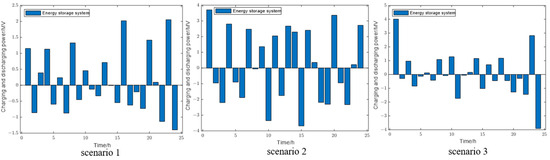 Scenario 3’s energy management profile, as illustrated by Figure 6, suggests a highly strategic and dynamic system operation, with sharp peaks in charging and pronounced troughs in discharging, indicating aggressive energy turnover within the 24-h cycle. Upon comparative analysis, Scenario 3 emerges as superior for an energy storage system due to its dynamic operation. Unlike Scenario 1, which shows moderate charging and discharging, and Scenario 2, which indicates higher utilization, Scenario 3 demonstrates the most significant range of power fluctuations. With peaks nearly reaching 5 MW and troughs around −4 MW, Scenario 3 suggests an aggressive and responsive energy management strategy. It indicates that the system robustly adapts to varying energy supply and demand conditions, optimizing its storage capacity. The pronounced activity in Scenario 3 likely reflects strategic operational decisions to store energy during periods of low cost or excess supply and discharge during high demand, potentially leading to improved efficiency and cost-effectiveness. Thus, Scenario 3’s utilization pattern may be indicative of a more economically savvy and operationally efficient system.
