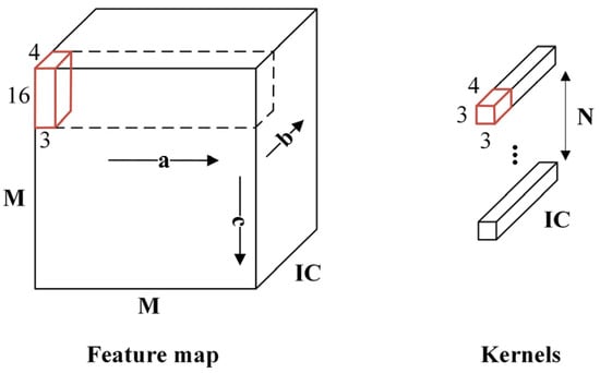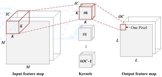 - Output channel parallelism: The number of output feature map channels in a CONV layer depends on the number of kernels. Each channel of the input feature map is convolved with the corresponding channel of each kernel, and the feature data are reused. Performing convolution with multiple kernels simultaneously reduces the number of data reads and improves the throughput of the computational units. This parallelization method has the highest requirement for computational and buffer resources.