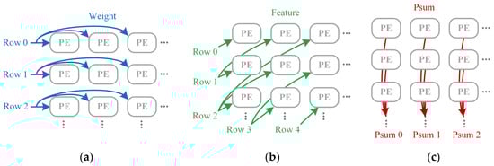 Optimized dataflow in the PE array: (a) dataflow of weights; (b) dataflow of features; and (c) dataflow of psums.