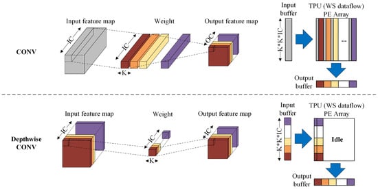 Secondly, due to the lack of output channel parallelism during depthwise CONV, deploying it in highly parallel accelerators can lead to a decrease in acceleration efficiency. When computing standard CONV on hardware accelerators, the input is typically fetched once and then reused by multiple kernels to minimize memory access. In lightweight networks, each output of depthwise CONV is the result of a single-channel MAC operation. Therefore, there is no parallel dimension among different kernels. Deploying lightweight networks on traditional accelerators results in a lack of computational parallelism, directly reducing efficiency. Taking the mapping of standard CONV on TPU [] as an example, as shown in Figure 3, in the architecture based on the weight-stationary (WS) dataflow, each column of the PE array processes the computation of a single output channel (a single kernel). The weights are preloaded into the PEs, and the input feature map is loaded from the global buffer into the input buffer, which is then sent to all the columns in the PE array to perform convolutions with different kernels. Unlike standard CONV, which performs parallel computations with multiple columns of PEs, depthwise CONV only uses a single kernel. Therefore, there is only one column in the PE array needed to map the computation of the only kernel, while the other columns remain unused.