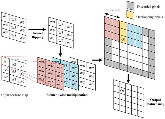 The IOM computation scheme [] evenly distributes the computation tasks of the input feature map pixels to each PE unit, while avoiding the process of padding the input feature map with zero values. The computation can be described as follows. (1) The weights of the kernel are flipped vertically and horizontally. (2) Each individual pixel of the input image is multiplied element-wise with the flipped kernel. (3) The resulting outputs are arranged as shown in Figure 4. The overlapping pixels are accumulated, while the edge pixels are discarded in the final output. (4) Repeat the above steps for all the input feature map pixels until the final output is obtained.