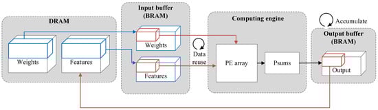 The tiling computation flow and top hardware modules are illustrated in Figure 5. All the weight data, input images, and intermediate output results are stored in the off-chip DRAM. The on-chip buffer consists of a total of 1164 KB of BRAM, and a fixed number of blocks of data are stored in it at a time. The data entering buffer are continuously reused and further divided into PEs. After a fixed computation cycle, the psums of the output are accumulated in the output buffer. Once the computation is completed, the resulting output feature map is returned to the corresponding address in DRAM as the input data for the next layer.