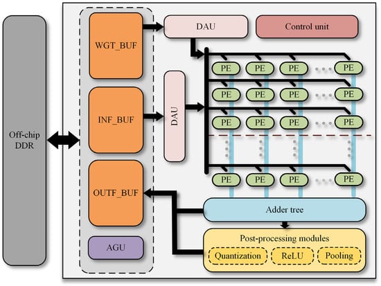 The hardware architecture of the designed accelerator in this paper is depicted in Figure 6. The accelerator comprises several key modules, including the on-chip buffer, control unit, address generate unit (AGU), data allocation unit (DAU), PE array, and post-process modules. The on-chip buffer consists of the input buffer (INF_BUF), weight buffer (OUTF_BUF), and output buffer. These buffers are respectively responsible for storing the tiled input feature map data, weight data, and results from the computation units. The AGU generates addresses for reading and writing for the buffers. The DAU handles the transmission of 128-bit data to the corresponding registers in the PEs. The PE array is an array of interconnected PEs that perform MACs and data flowing. The output of the PE array is connected to an adder tree, which outputs the final convolutional results. The post-process units encompass operations such as quantization, dequantization, pooling, and ReLU, performing necessary computations beyond convolutions.