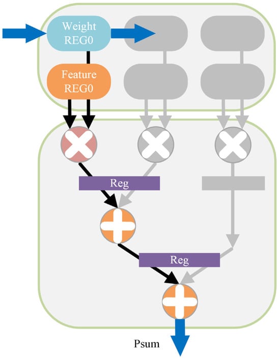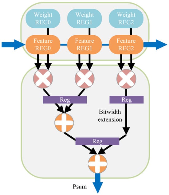 In the PE array, this design maps the computations of each sliding window to the PEs in the same column of a sub-array, with each PE responsible for calculating a row in the sliding window. Since most CONV layers in computer vision applications currently use small kernels, three PEs are required to calculate one sliding window when each PE calculates one row. Therefore, the size of the sub-array is designed to be 3 rows. The 14 columns of PEs are designed to perform parallel MACs of 14 sliding windows per cycle. Four sub-arrays parallelize the convolution calculations for four input channels. Each PE is responsible for calculating the MAC of one row ( elements) within the sliding window. Therefore, each PE is internally designed with three sets of INT8 fixed-point MAC logic, as shown in Figure 7. By adding the results of the three PEs in the same column, the computation of one sliding window can be completed. Each PE contains three registers for temporary storage of weights and feature values. Since the kernel size is small, the WS dataflow can be used to map the weight values. The movement of the sliding window is achieved via the flow of feature values inside the PE. Specifically, the weights remain stationary in the internal registers, while the feature values are element-wise shifted in the registers, accomplishing the horizontal sliding of the kernel on the input feature map.