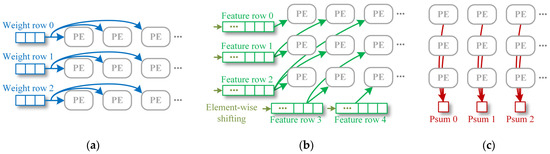 RS dataflow in a PE array: (a) dataflow of weights; (b) dataflow of features; and (c) dataflow of psums.
