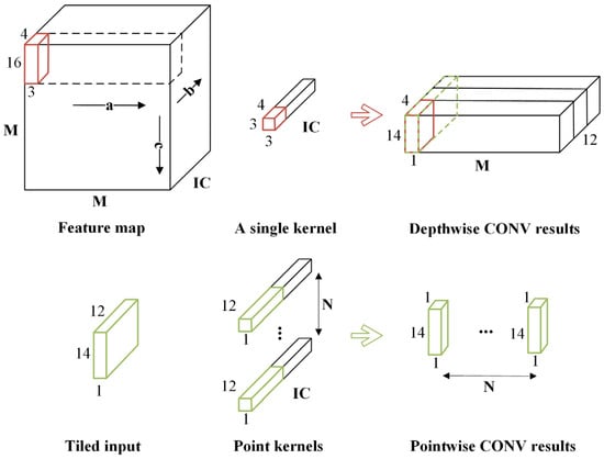 For standard CONV, taking VGG16 [] as an example, the floating-point computational load for a single inference task is approximately 15 GFLOPs, and the memory access load is around 600 MB. Therefore, its computational intensity is 25 FLOPs/Byte. In the case of MobileNet, which uses depthwise separable CONV, the computational load is approximately 0.5 GFLOPs, and the memory access load is 74 MB. Compared to the memory access load, the computational load has been significantly reduced, resulting in a lower computational intensity of only 7 FLOPs/Byte. The low computational intensity leads to lower acceleration efficiency for MobileNet, making it suitable for hardware platforms with limited computational resources and low parallelism. It cannot fully utilize the computational resources of large-scale parallel computing platforms.