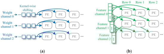 Dataflow of pointwise CONV in the PE array: (a) dataflow of weights; and (b) dataflow of features.