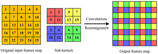 After splitting the kernel, convolutions can be directly performed using the four sub-kernels, eliminating the zero-padding process and making DeCONV perfectly fit the dataflow of CONV. As shown in Figure 15, each new sub-kernel performs convolution with a stride of 1 on the original input feature map, and the results obtained by each sub-kernel are rearranged according to a fixed rule. Therefore, compared to CONV, this optimized DeCONV dataflow only requires additional logic for kernel-splitting and result rearrangement. This enables the universality of both the CONV and DeCONV dataflows in terms of the hardware resources and operating modes.