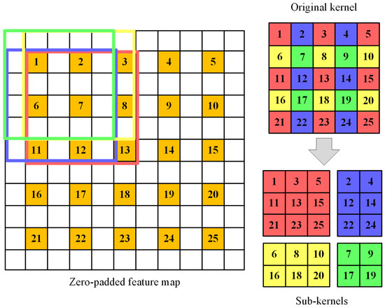 The DeCONV method for kernels of other sizes follows a similar principle, but the difference lies in the sizes of the sub-kernels. For example, when the kernel size is , sub-kernels of different sizes are generated, as shown in Figure 16.
