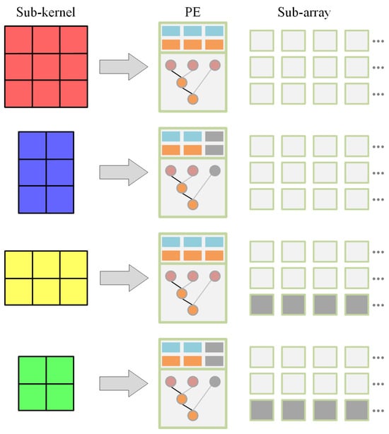 The mainstream hardware acceleration method for CONV utilizes a PE array, which is composed of interconnected PE units, to perform CONV computations. Each PE is only responsible for one or some multiply–accumulate (MAC) operations. After transferring data between regularly arranged PEs, CONV can be completed by the PE array. This design also can achieve a very high degree of parallelism, because the PEs are computing the MACs simultaneously. The separate MAC unit design is currently used in various FPGA designs, such as CNN accelerators [,], and hardware implementation of other algorithms [].