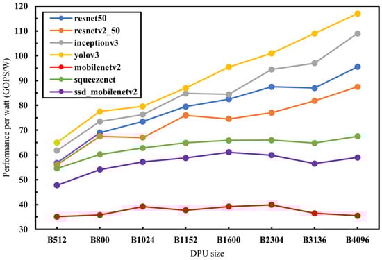 As shown in Figure 20, when running models primarily composed of depthwise separable CONV, the performance per watt of the DPU is noticeably lower compared to models dominated by standard CONV. Moreover, the performance disparity becomes larger with the increase in the DPU scale and parallelism. In the B4096 DPU, which has the highest resource usage and parallelism, the performance per watt of the YOLOv3 network is approximately 3.3 times that of the MobileNetV2. The performance per watt of depthwise separable CONV in DPUs of different parallelism consistently remains at a lower level, and the resource utilization decreases as the usage of resources increases. This indicates that there is a resource utilization bottleneck for depthwise separable CONV in the DPU.