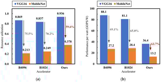 The comparative experiment when running VGG16 and MobileNetV1: (a) comparison of resource utilization; and (b) comparison of performance per watt.