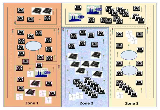 Just as physical cities are divided into neighborhoods, a smart city can also be segmented into multiple zones (or partitions) that exhibit common characteristics [22]. Moreover, citizens within these zones can share common objectives and collaborate to optimize the utilization of available services, including energy-related services [23]. Additionally, dividing smart cities into zones enables the provision of specialized services tailored to the specific needs of each zone. The concept of smart city zones was first introduced in [24] as a means to effectively manage electricity consumption in smart cities, as illustrated in Figure 1.