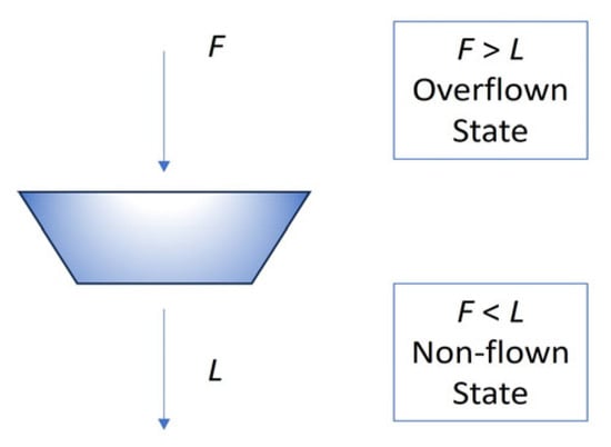 Visualization of a leaky bucket and its states, s, where F and L denote the incoming and outcoming flow respectively.