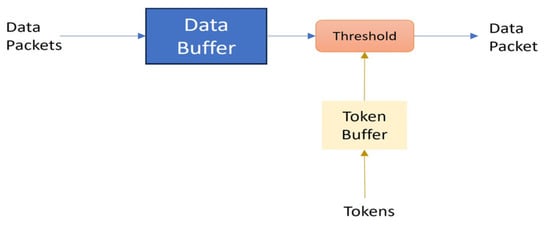 An alternative rendition of the leaky bucket is the token-driven leaky bucket, primarily employed to regulate the rate of leakage from the bucket. The block diagram of this version is depicted in Figure 3. The fundamental concept revolves around two buffers: the data buffer and the token buffer. The data buffer receives input data packets, while the token buffer receives tokens. A data packet is released from the buffer only if the number of buffered tokens surpasses a predefined threshold. Importantly, the threshold is determined by the modeler based on the requirements of the specific application in question.