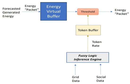 The block diagram illustrating the fuzzy leaky bucket algorithm for energy allocation is provided in Figure 4. It’s important to note that this method involves the utilization of a fuzzy logic inference system to determine the number of tokens in the leaky bucket, consequently influencing the release of energy from the buffer. Another innovative aspect is the introduction of energy packets, which integrate with the concept of the virtual buffer [38]. The term "energy virtual buffer" refers to the data structure that “virtually stores” energy amounts. This data structure is crucial since energy is a commodity that must be consumed in real time and cannot be stored on a large scale [39,40].