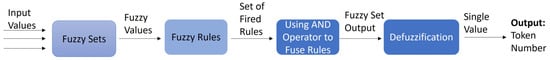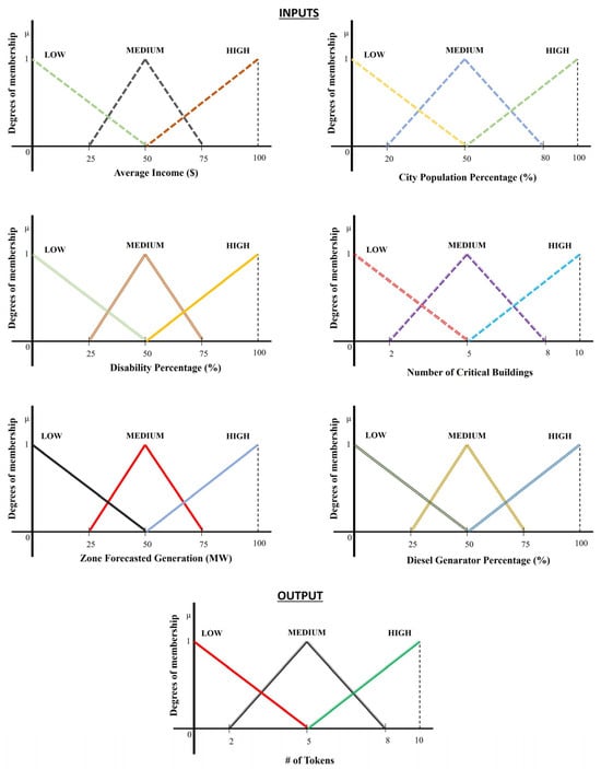As illustrated in Figure 5, the aforementioned variables are transformed into fuzzy variables through fuzzification, with each variable depicted in Figure 6 as fuzzy sets. It’s important to note that fuzzy sets enable the expression and large-scale representation of multiple values within the variables using simple linguistic terms [45,46,47,48]. Furthermore, fuzzy logic facilitates the fusion of fuzzy variables into a single output, which takes the form of token numbers in this manuscript. Selection of the type of the fuzzy sets, which take the form of triangles, is based on past experience of the modelers; furthermore, triangular fuzzy sets is a common choice in fuzzy inference systems.