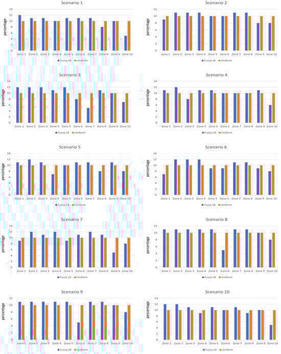 The simulated results have been meticulously recorded and are presented to showcase the social justice aspect of the proposed approach. We simulated 10 different scenarios, the values of which are detailed in Table 2. The allocated energy for each scenario is depicted as a function of the social variables outlined in the preceding section. The results obtained are illustrated in Figure 8, where the energy allocation using the Fuzzy Leaky Bucket is compared to that obtained with the uniform round-robin method in terms of the percentage of available energy allocated to each zone. These comparisons provide valuable insights into the effectiveness and fairness of the proposed approach, offering a clear evaluation of how energy is distributed across different zones under varying social and energy conditions within the smart city.