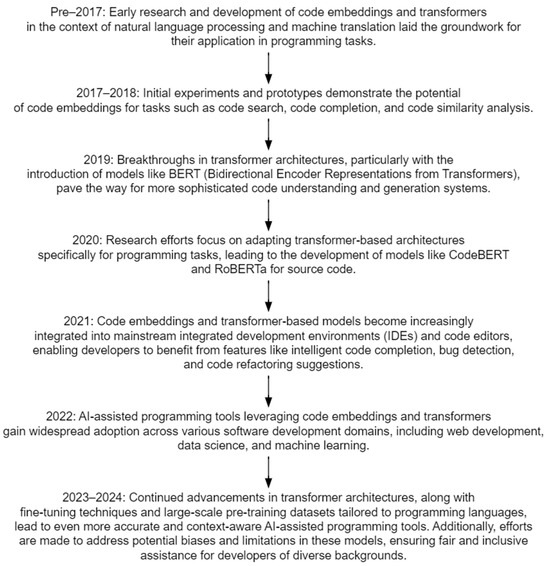 In Figure 1, the timeline showcases the evolution of AI-assisted programming tasks utilizing code embeddings and transformers from their early stages of experimentation to their integration as indispensable tools in modern software development workflows.
