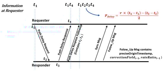 The synchronization procedure consists of the Requester entity (TSN device which wants to synchronize to the master) requesting the Responder entity (TSN device to which all other TSN devices synchronize to) to initialize the synchronization process. After initialization, the Requester sends a path delay measurement request to the Responder, which responds with a path delay measurement response and a follow-up message. In this three-message exchange, the Requester gathers four timestamps, as shown in Figure 1. In the propagation delay measurement process, a symmetric link is assumed. This is true for wired networks, but for wireless networks, with asymmetric links, this assumption can adversely affect the outcome of the synchronization, as we will see in the Section 5 of this paper.