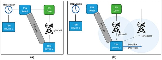 (a) Simulation scenario 1: TSN device 2 synchronizes with TSN Master via TSN Switch; (b) Simulation scenario 2: extension of scenario 1; handover between gNodeB1 and gNodeB2.