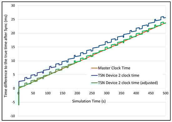 Both simulation scenarios are run for 500 s. Time synchronization occurs in 1 s intervals, and the propagation delay measurement interval is also set to 1 s. TSN device 1, TSN Switch, and TSN device 2 synchronize to the TSN Master, and the local device’s clock times of the master clock and the slave clocks, immediately before and after synchronization, are logged. In addition, propagation delay, residence time, and all four timestamps required for propagation delay measurement are also logged. Since these timestamps are used to calculate the link delay, they can be used to measure uplink and downlink delay, the delay variations, and the difference between uplink and downlink delay in the 5G network.